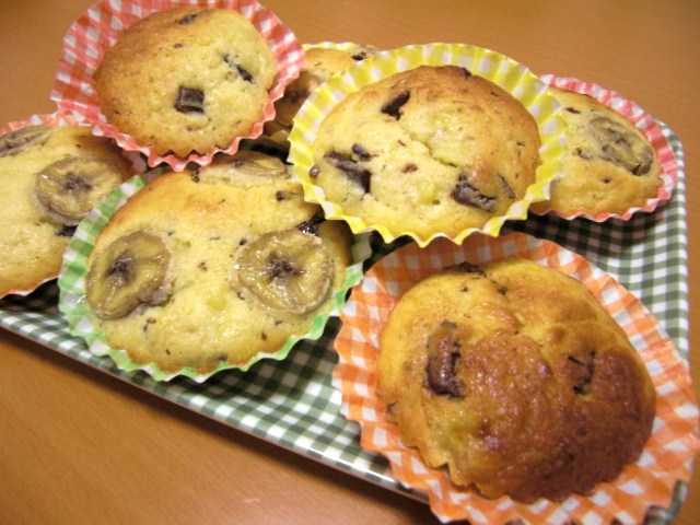 油と砂糖は少し減らし、バナナを増量。重曹はないのでベーキングパウダーのみです。チョコチップもわざわざ買うと高くつくので板チョコを刻んで代用。