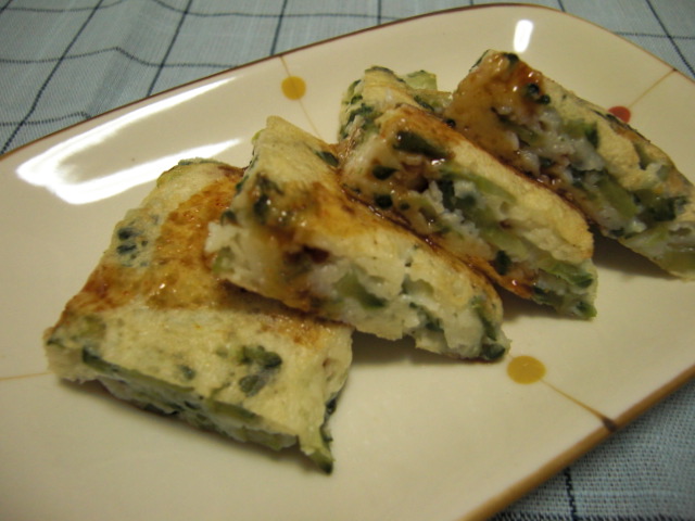 ゴーヤーは摩り下ろした大和芋と卵と和風だしの素をと混ぜてフライパンで焼きました。
