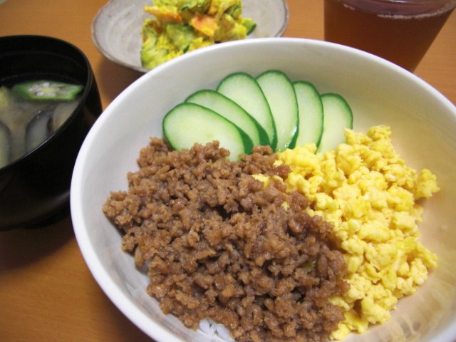 だいたいこの暑い中、味噌汁作るなんてエライ!と自分で思ってしまう。なるべく火使いたくないですよね~。しかも今日は鶏そぼろ、水分飛ばすためにクツクツと煮込みましたよ~。暑かったー。