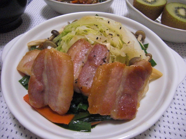 先月の終わりに仕込んだやつをそろそろ使い切らなければいけないので、厚めに切ってこんがり焼いて、あり合わせの野菜を投入、蓋をして蒸し焼きにしました。