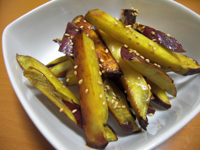 さつまいもはスティック状に切って油を敷いたフライパンに並べて焼き色が付いたら裏返し、裏側も焼き色が付いたらあとはジャジャッと炒めて、砂糖・はちみつ・水・醤油を合わせたタレを投入。ゴマを振って出来上がり♪