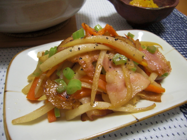 大根・人参・玉ねぎ・かぼちゃ・里芋・ごぼう・ほうれん草・水菜・にんにく、それにベーコン。