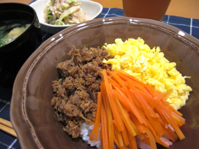 本当は緑のものや何やら入れて彩りよく五色くらいにしたかったけど、家にあるものだけでササッと作った三色丼です。