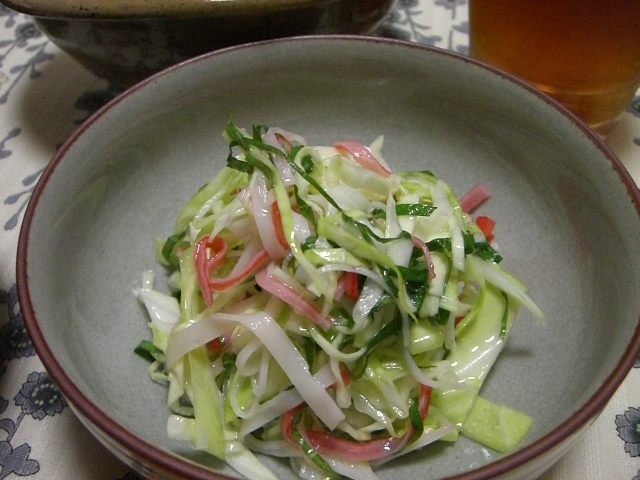 コールスローと言ったらキャベツとハムをフレンチドレッシングで和えたものですが、今日はハムがなかったので代わりにカニカマを使用しました。