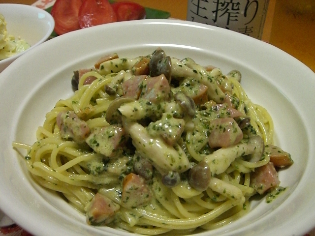 ④③にバジルペーストと茹で上がったスパゲティを投入し、手早く絡めて出来上がり。