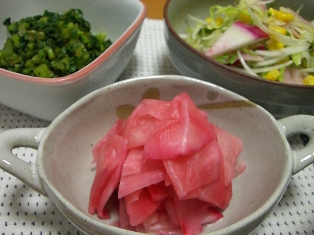 写真で分かるでしょうか、右奥に見える白と赤紫っぽいのが元々の色で手前が甘酢に漬けたもの。