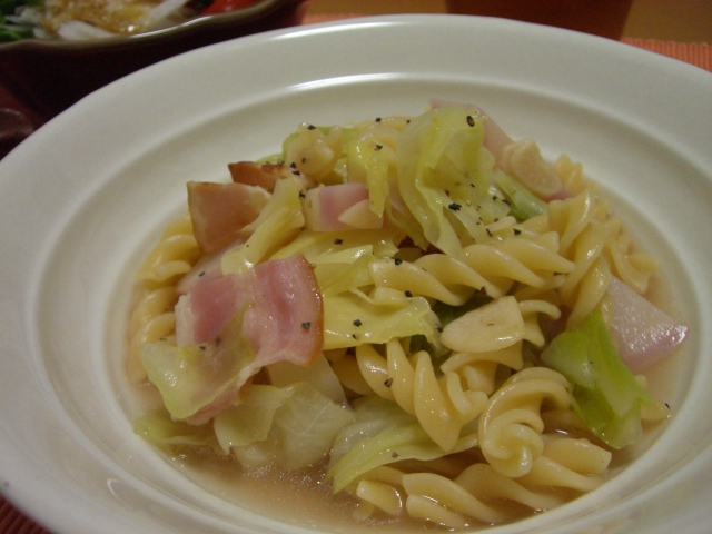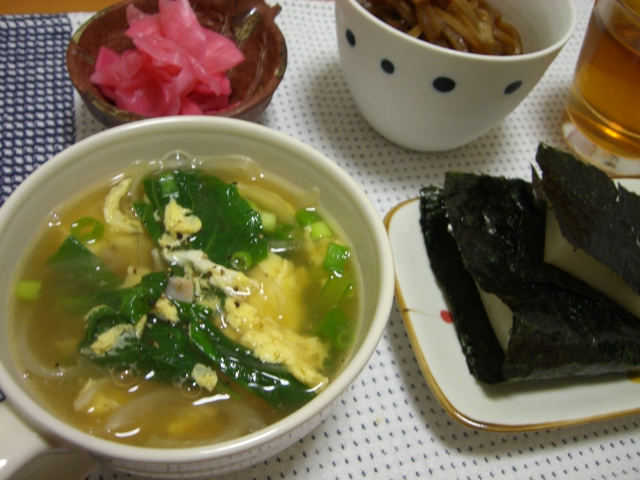 キャベツと小松菜とネギと卵入り。鶏ガラスープの素・塩・醤油などで味付けしました。