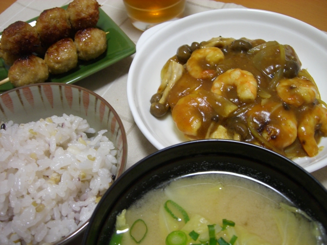 ② ①を油で揚げ、つくね(市販品)と玉ねぎも揚げ、油を切っておく。