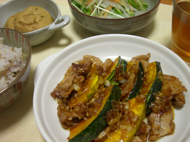 今日のメニューは過去に何度か登場している「かぼちゃと豚肉の香味酢漬け」をちょっと変えたもの。