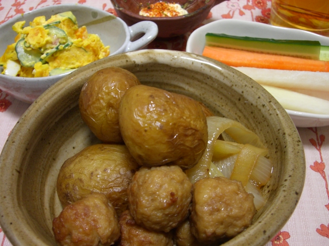 揚げただけでも美味しそうだったんですが、その誘惑に負けずに鶏つくねと煮ました。