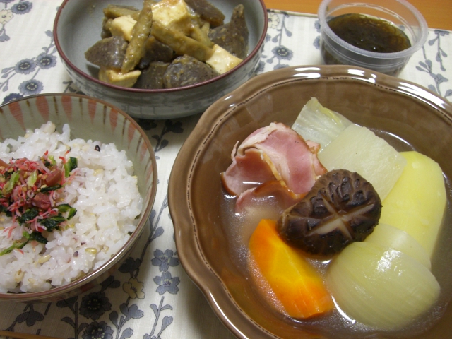 味噌スープは、和風だしの素の代わりに鶏がらスープの素を使って白菜とベーコンを煮て、味噌を溶いたら牛乳と仕上げにバター少々を入れます。