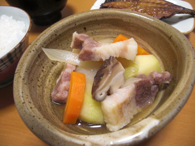 塩茹でしただけの野菜は、いつもの作り方よりも素材の旨味が出ていて美味しい!玉ねぎのシャキシャキ感が残っているけどそれもまたいつにない新鮮な食感でいい!カレーやシチューのじゃがいもは味が染み込んでないからあんまり好きじゃないけど、どうせ染み込まないならこちらの方が潔くていい!塩味はするし。