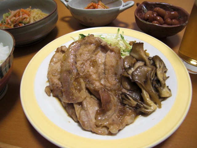 食べる方もガッツリいきたかったのでビールにもご飯にも合う豚の生姜焼き。舞茸をトッピングして。