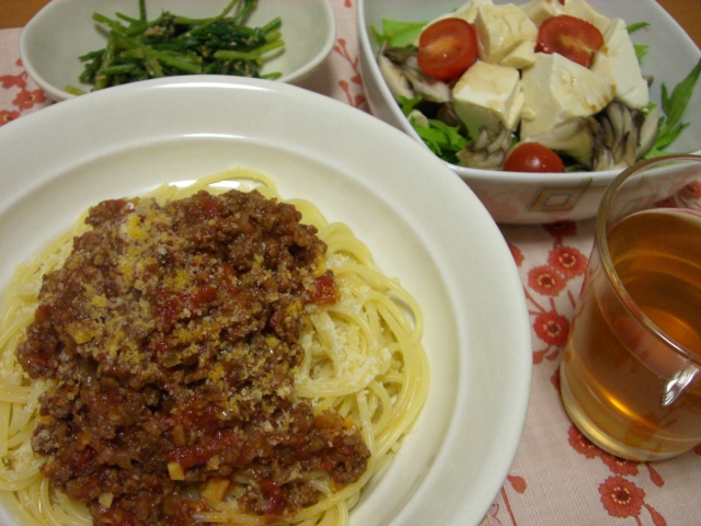 私の中の「お米食べよう運動」はまだ続いているので今日もご飯を食べたかったんだけど、牛挽き肉で作るご飯と組み合わせるメニューがハンバーグ(この前食べた)か カレー(今日のお昼に食べた)くらいしか思いつかなかったので、残念ながら今日はパスタにしてしまいました。