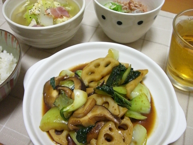 チンゲン菜・レンコン・椎茸を炒め、鶏がらスープを加えてオイスターソースと甜麺醤で味付け。