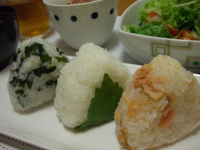 わかめおにぎりは乾燥わかめを水で少し戻して、水気を絞って刻み、塩とゴマを合わせたもの。