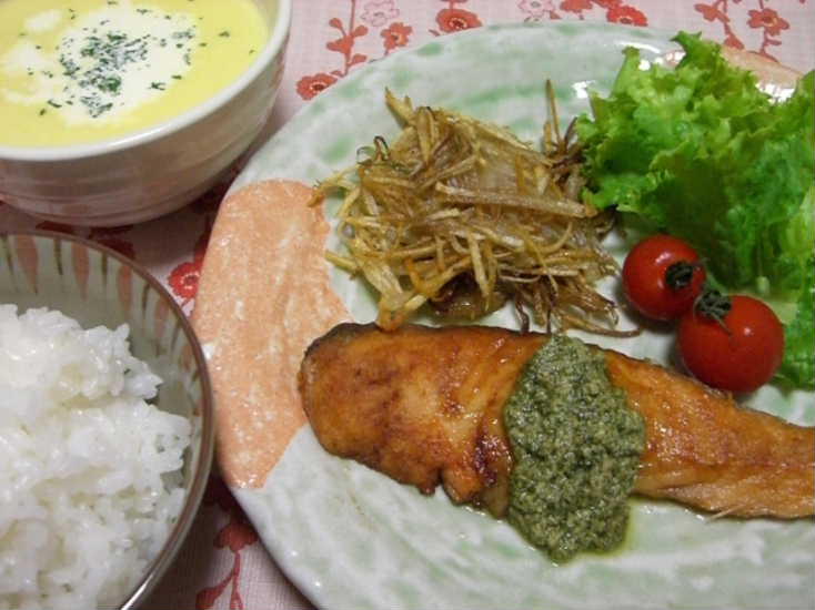 甘塩鮭なので下味を付けなかったのですが、バジルソースに結構塩分が入っているのでちょっとしょっぱかったです。
