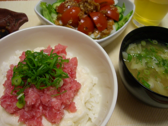 まずネギトロを買ったので、ストックしてある酢飯にすり下ろした山芋とネギトロとネギを乗っけて丼に。