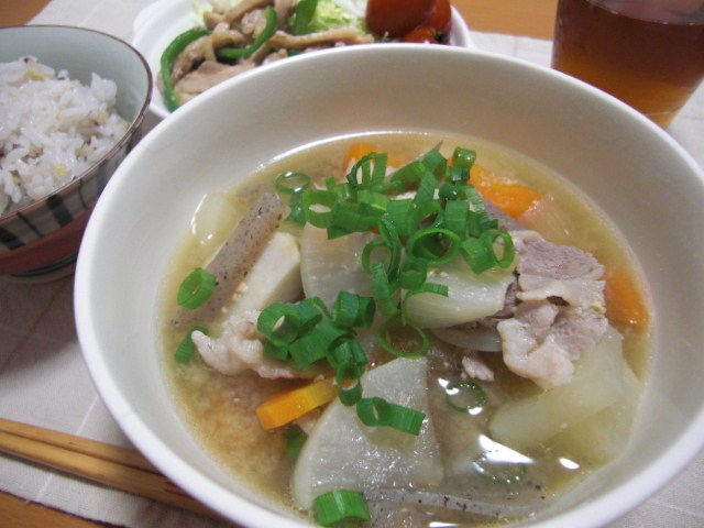 内容は、玉ねぎ・人参・じゃがいも…は定番で、それプラス、里芋・キャベツ・椎茸・大根・カブ・ほうれん草・ピーマン・にんにく・生姜。入れ忘れて添えたミニトマトを含めれば野菜が13種類!ちなみにお肉は豚肉で、冷凍してあったイワシハンバーグ(いつの?)もトッピング。