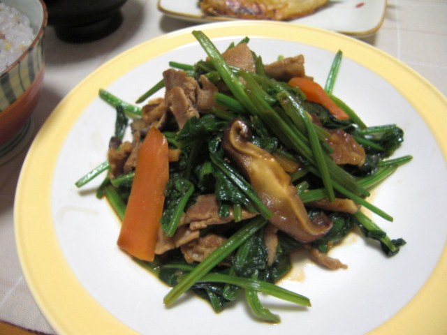 ほうれん草が沢山採れるとのことで欲張っていっぱい貰ってきちゃったけど、ごま和えやおひたしにしたり、炒めたり、グラタン、シチューなど、一通りのメニューにしたので食べ飽きました。今日は変わった食べ方にしようと味付けに工夫。イメージ的にはホイコーローのほうれん草バージョンです。豚肉と人参・椎茸・にんにく・生姜と炒めて酒・テンメンジャン・醤油で味付け。
