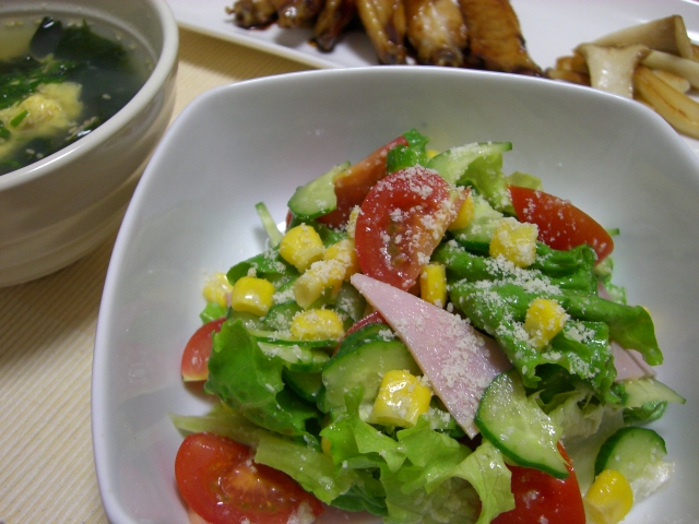 調べればいいのに、何となくこんな感じかなあ?と作ったドレッシングは、サラダ油・酢・塩を合わせたフレンチドレッシングに粉チーズと少量のにんにくを加えたもの。