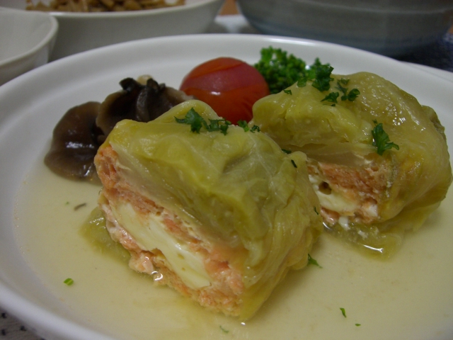 春キャベツがたくさんあることだし、ロールキャベツを作ろうと挽肉を買ったのですが、鮭を巻いてみたらどうだろう?と思い急遽変更。