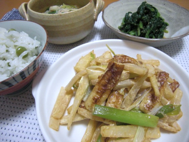 炒め物は、ちくわ・大根・長芋・ネギを同じように切って炒めて、酒・オイスターソース・マヨネーズを絡めたらできあがり。あ、あとニンニクも入ってます。